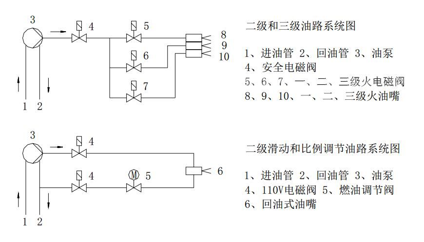 燃料系統(tǒng)的功能在于保證燃燒器燃燒所需的燃料。燃油燃燒器的燃料系統(tǒng)主要有:油管及接頭、油泵、電磁閥、噴嘴、重油預(yù)熱器。燃?xì)馊紵髦饕羞^濾器、調(diào)壓器、電磁閥組、點(diǎn)火電磁閥組。